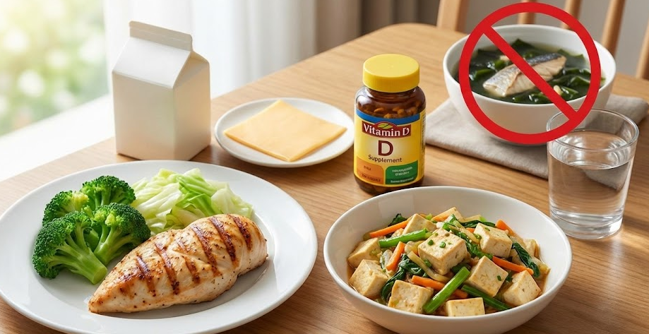 - 비타민 D: 칼슘 흡수를 돕기 위해 비타민 D 영양제를 따로 복용하거나, 하루 20분 이상 햇볕을 쬐는 것이 필수적입니다.