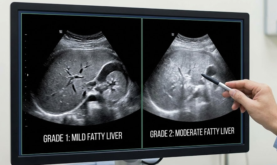 의학적으로 지방간은 전체 간 무게의 5% 이상이 지방일 때 진단합니다. 하지만 환자가 자신의 간 무게를 잴 수는 없기에, 보통 복부 초음파 검사를 통해 간의 밝기(Echogenicity)로 단계를 구분합니다.