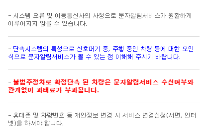 알림 서비스는 운전자의 편의를 위한 '사전 통보'일 뿐, 단속 확정 시 문자 수신 여부와 관계없이 과태료는 부과됩니다. 알림을 받았더라도 5~10분 이내에 차량을 이동하지 않으면 단속이 확정됩니다.