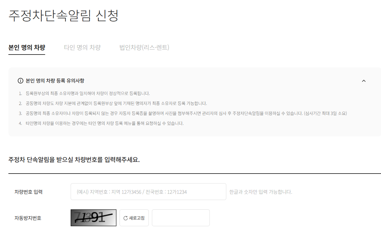 신청 정보 입력: 간단한 개인정보(이름, 휴대폰 번호)와 차량 번호(최대 2대)를 입력하고 약관에 동의하면 끝!
