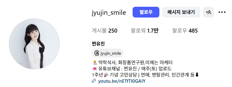 서울대약대 석사 & 화장품연구원 & 마케터 아름답고 건강하게 사는 법 📧 contact : yujinjin@kakao.com 💌 Instagram : @Jyujin_smile