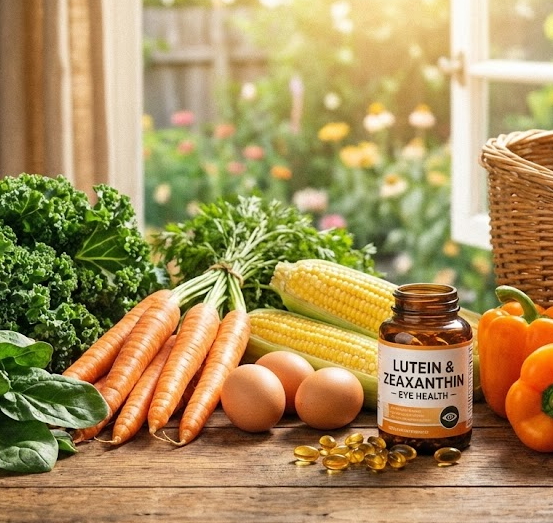 루테인과 지아잔틴 (Lutein and Zeaxanthin): 이 두 가지 카로티노이드 성분은 눈의 망막 중심부인 황반에 집중적으로 존재하는 핵심 색소입니다. 황반은 시력의 90%를 담당하는 중요한 부위로, 루테인과 지아잔틴은 푸른 빛을 흡수하여 유해한 활성산소로부터 황반을 보호하는 '천연 선글라스' 역할을 합니다. 시금치, 케일 등 짙은 녹색 채소에 풍부하게 들어 있습니다.