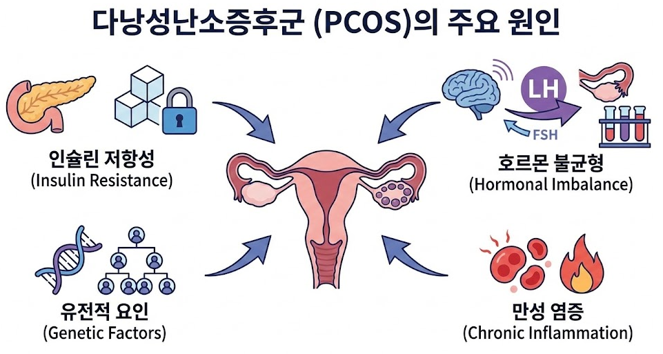 진료실에서 환자분들을 만나보면 "제가 살이 쪄서 그런가요?"라며 자책하시는 분들이 정말 많아요. 결론부터 말씀드리면, 단순히 살이 쪄서 생긴 게 아니라 **'몸의 시스템이 오작동'**을 일으켜서 살이 찌고 생리가 멈춘 거예요. 원인을 정확히 알아야 치료의 방향도 잡을 수 있답니다.