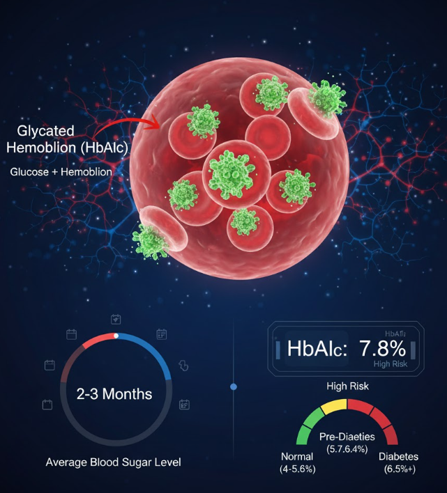 당화혈색소는 혈액 속의 포도당이 적혈구 내의 헤모글로빈(혈색소)과 결합한 상태를 말합니다. 적혈구의 수명이 보통 120일 정도이기 때문에, 당화혈색소 수치를 통해 최근 2~3개월 동안 혈당이 얼마나 잘 관리되었는지를 알 수 있습니다.