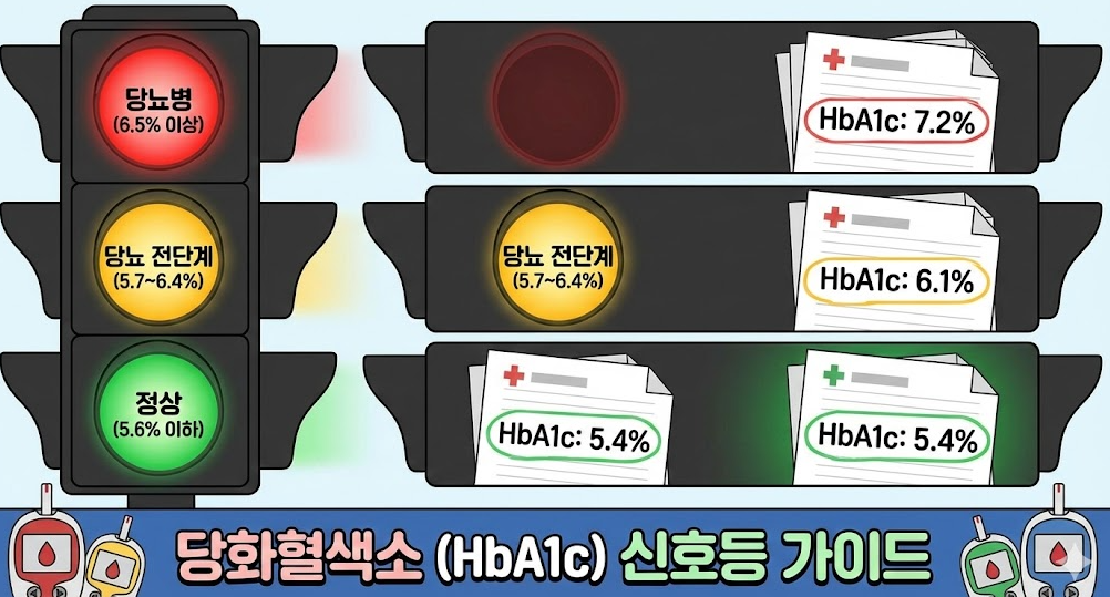 - 당뇨 전단계: 5.7% ~ 6.4% (주의가 필요한 노란불)
