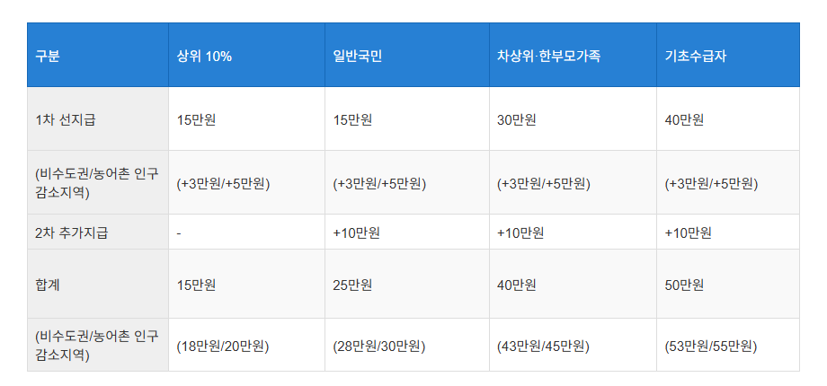 지원 금액: 1인당 25만 원이 지급됩니다! 4인 가구라면 무려 100만 원! 가족 구성원 수에 따라 지원금액이 달라지니 지원 금액을 확인하세요!!