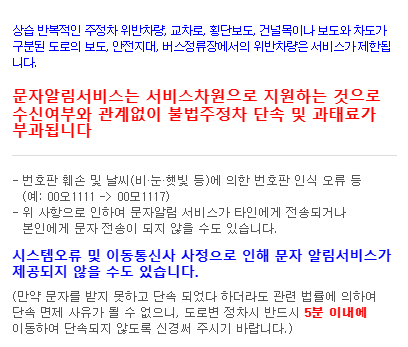 알림 문자는 하루에 한 번만 와요. 같은 장소에서 여러 번 단속되더라도 한 번만 알림이 오니, 문자를 받으면 바로 차를 이동해야 해요.