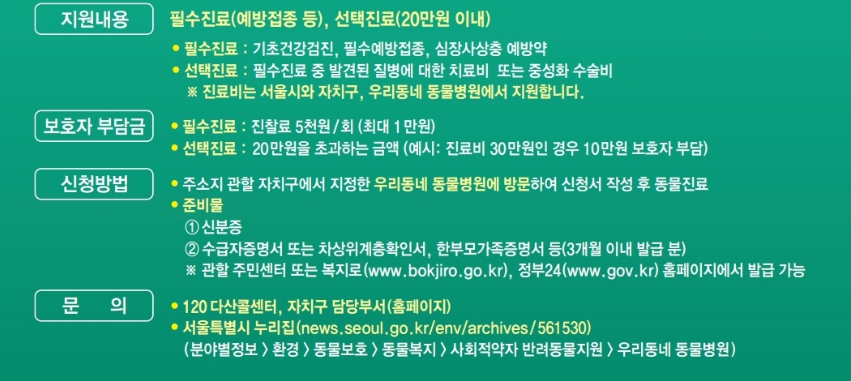 하지만 희소식이 있습니다! 서울시에서는 이런 부담을 덜어드리고자 '우리동네 동물병원' 사업을 운영하고 있다는 사실! 취약계층이 기르는 반려동물에게 필수 동물의료를 지원하여, 반려동물도 보호자도 모두 건강한 삶을 누릴 수 있도록 돕는 아주 착한 복지 사업입니다.