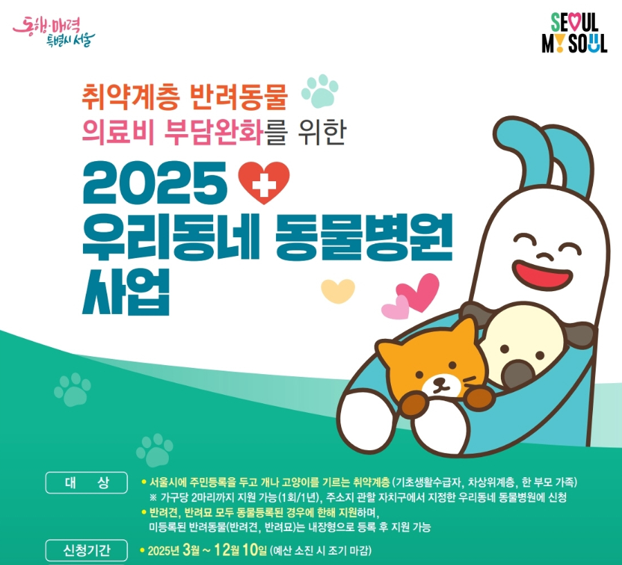 반려동물과 함께하는 모든 서울 시민이 경제적 부담 없이 건강하고 행복한 삶을 누릴 수 있도록, 서울시의 따뜻한 지원은 계속됩니다!