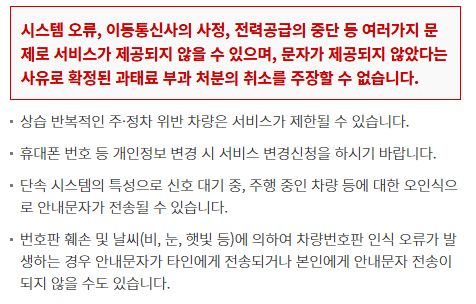 상습 위반은 안 돼요: 이 서비스는 어디까지나 단속을 피하라고 알려주는 것이 아니라, 잠시 부주의로 인해 단속될 위기를 막아주는 역할입니다. 같은 장소에서 여러 번 단속되거나 상습적으로 위반할 경우 서비스 이용이 제한될 수 있습니다.
