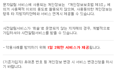 이 서비스는 운전자가 고정식/이동식 CCTV 단속 지역에 일시적으로 주정차했을 경우, 단속 지역임을 휴대전화 문자 메시지로 실시간 안내하여 과태료 부과를 사전에 방지하고 차량의 자진 이동을 유도하는 목적으로 운영됩니다.