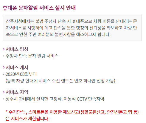 이 서비스는 상주시를 방문하거나 거주하는 운전자라면 누구나 무료로 신청하여 이용할 수 있으며, 시민들의 경제적 부담을 줄이는 동시에 상주 지역의 교통 질서 의식을 높이는 데 기여하고 있습니다.