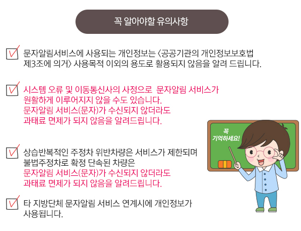 이 서비스는 시 전역의 불법 주정차 단속 CCTV 구역에서 단속 차량이 운전자의 차량을 촬영했을 때, 미리 등록된 운전자에게 단속 사실을 휴대전화 문자 메시지로 즉시 알려주는 시스템입니다. 문자 알림을 받은 운전자는 신속하게 차량을 이동하여 과태료 부과를 사전에 예방할 수 있습니다.