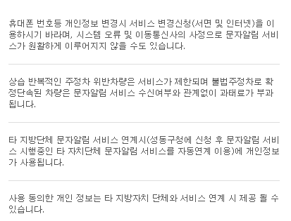 성동구 외 다른 지역 주차는 해당 구청에 신청해야 해요. 이 서비스는 성동구에서만 유효해요. 다른 구에 주차할 땐 해당 구청의 알림서비스를 따로 신청해야 한다는 점, 잊지 마세요.