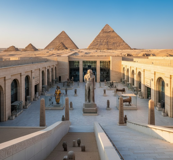 - 주요 전시: 투탕카멘 무덤 유물 5,000점 전체 공개, 람세스 2세 거상, 다양한 파라오 시대 유물.