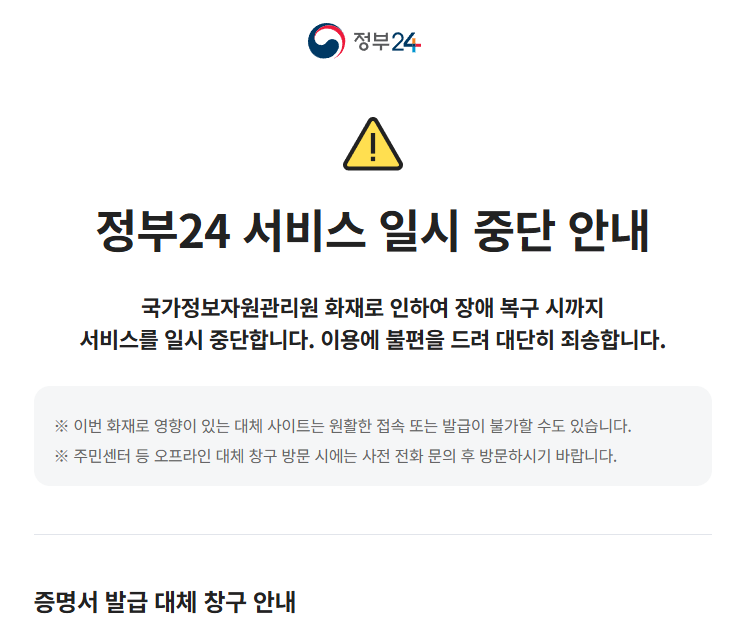 주민등록 등본, 초본, 사실 증명서 발급, 국민안전고 오류, 증명서 발급 대체 정보, 행정사이트긴급 상황! 지금 당장 필요한 행정 서비스 대체 이용 방법 정부는 이번 사태의 위기경보를 최고 수