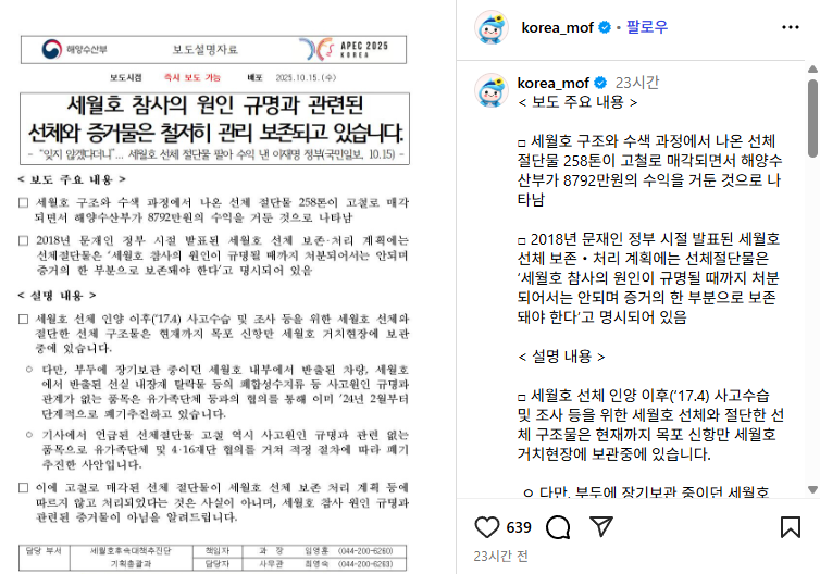 하지만 이지인포유가 확인한 바에 따르면, 해양수산부가 이 절단물 258톤을 지난 2025년 7월에 고철로 매각하여 약 8,792만 원의 수익을 거둔 것으로 드러났습니다.