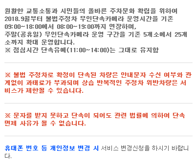 주차단속 알림 서비스는 차량이 주정차 금지 구역에 주차되었을 때, 지자체의 CCTV가 단속을 시작하기 직전에 운전자의 휴대폰으로 경고 문자 메시지(SMS)를 보내주는 시스템입니다.