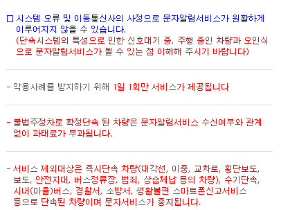 문자 수신 여부와 무관한 과태료: 통신 환경 문제(통신장애, 인식 오류 등)로 문자가 지연되거나 오지 않았더라도, 불법 주정차가 5분 이상 확정되면 과태료는 부과됩니다. 이 서비스는 참고용이며, 운전자는 법규를 준수할 의무가 있습니다.