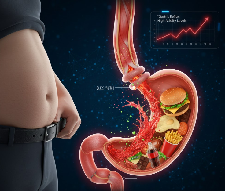 배에 압력이 가해지면 위장도 함께 눌리게 됩니다. 특히 복부 비만이 있는 경우 내장 지방이 위를 압박하여 위산 역류를 유도합니다.