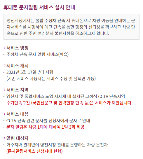 - 적용 지역: 영천시청에서 설치 및 운영하는 고정식/이동식 CCTV 단속 지역에 한하여 서비스가 제공됩니다.