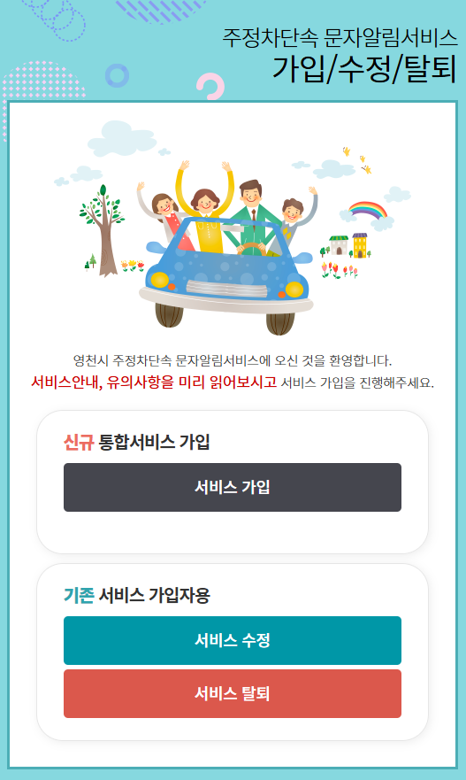 | 온라인 신청 | 영천시청 홈페이지 (교통/주차 → 불법주정차 단속알림서비스) 또는 '주정차 단속 알림 서비스 통합가입 도우미' 스마트폰 앱을 통해 신청합니다. | 통합 서비스를 통한 가입을 권장합니다. |