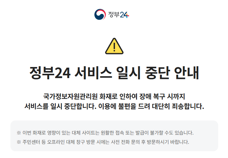 정부는 이번 사태의 위기경보를 최고 수준인 '심각' 단계로 격상하고, 중앙재난안전대책본부를 가동하며 신속한 복구에 총력을 기울이고 있습니다. 하지만 복구에 상당한 시일이 걸릴 수 있는 만큼, 당장 급한 민원 업무는 다음과 같이 처리하셔야 합니다.