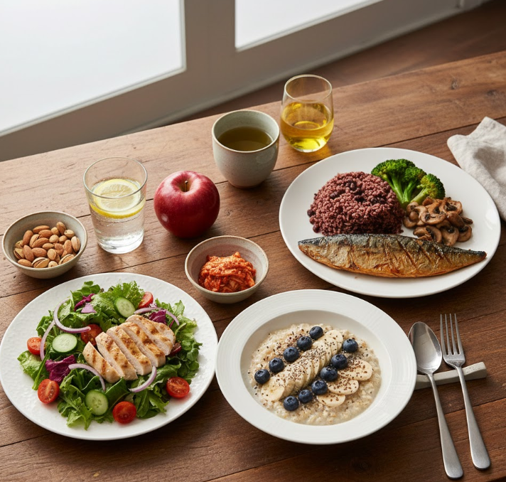 | 점심 | 현미밥과 콩밥 + 생선구이 (고등어/삼치) + 채소 반찬 | 식이섬유, 오메가-3, 식물성 단백질 |