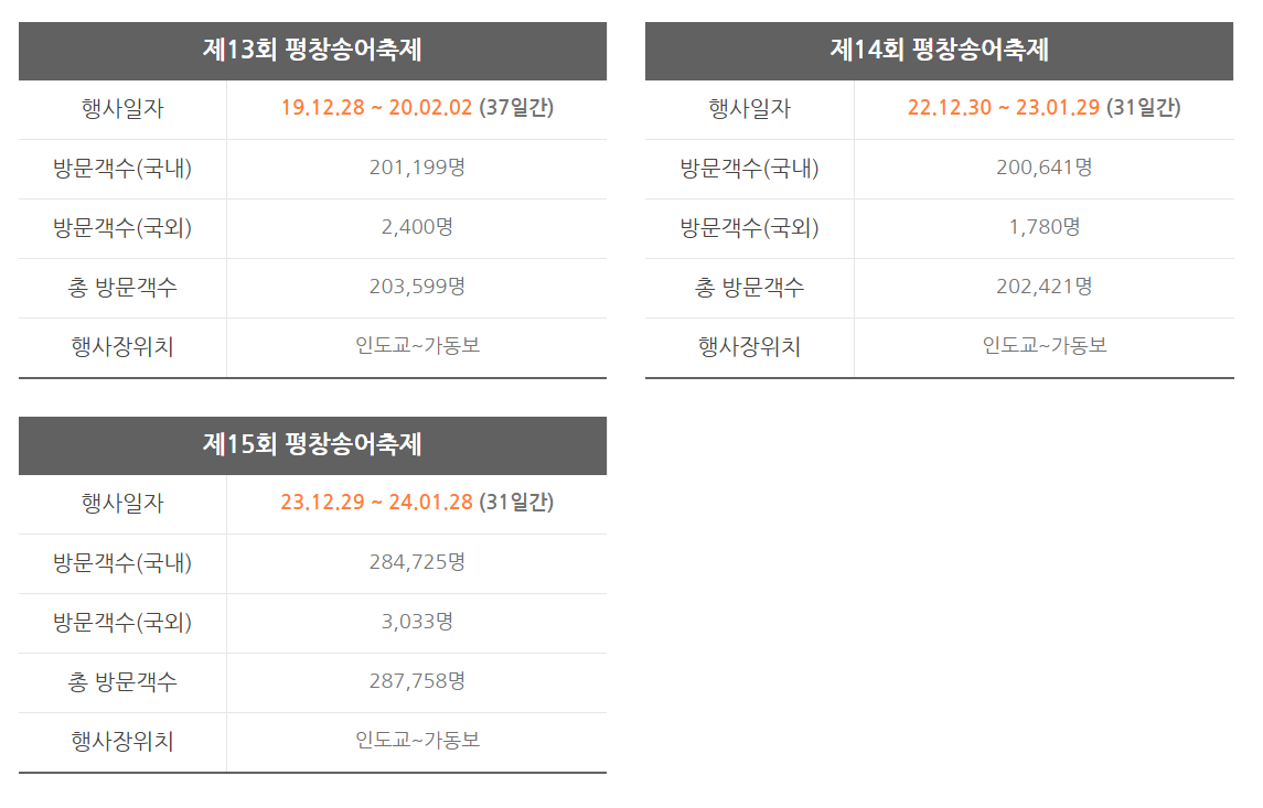- 주변 관광지 연계: 평창은 알펜시아 스키점프대, 월정사 등 주변에 다양한 관광 명소가 많습니다. 축제 관람과 더불어 평창의 아름다운 자연경관과 문화유산을 함께 둘러보는 일정을 계획해 보는 것을 추천합니다.