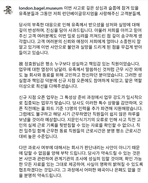 - 회사 측 초기 입장: 런던베이글뮤지엄 측은 초기에 "주 80시간 근무는 사실이 아니며, 고인의 주당 평균 근로시간은 44.1시간으로 전체 직원 평균과 유사하다"고 반박하며 과로사 의혹을 부인했습니다.