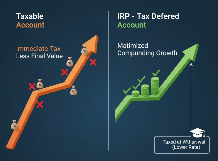 IRP 계좌 내에서 발생한 모든 운용 수익(이자, 배당, 펀드/ETF 매매차익 등)에 대해 당장 세금(15.4%)을 원천징수하지 않고, 연금 수령 시점까지 과세를 미뤄줍니다.